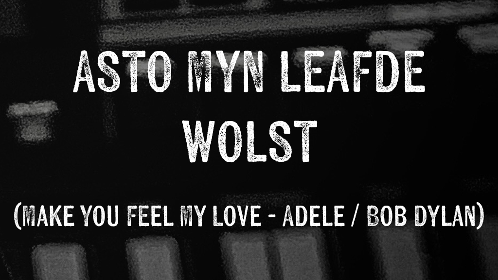 (Make You Feel My Love – Adele / Bob Dylan) As de rein wer slacht yn dyn gesichtEn de hiele wrâld tsjin dy isIs’t yn dizze earms datst skûlje kinstAsto myn leafde wolst As mei de skimer jûns it skaad ferskyntEn der net ien is dy’t dyn triennen fyntDan treast…