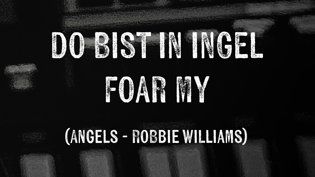 (Angels – Robbie Williams) Ik sit op wachtKomt in ingel foar it ljocht fannachtWant witsto wolMyn hert dat is sa folFan datsto hjir komstDe himel sjongtDat myn hoeder alle eangst ferdrongNo bin ik sa ticht by dyDat ik yn tinzen swijEn dyn leafde my befrijtDo bist in ingel foar my…