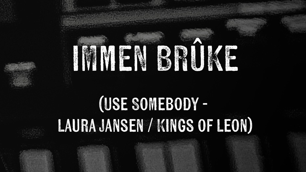 (Use Somebody – Laura Jansen / Kings of Leon)  Ik strún hjir mar wat om altyd like dom yn wat ik sisDraach in masker fiel my wakker wiis en wisWitsto ik kin wol immen brûkeWitsto ik kin wol immen brûke Sa’n ien as dy (In stjer as dy), dy’t gewoan…